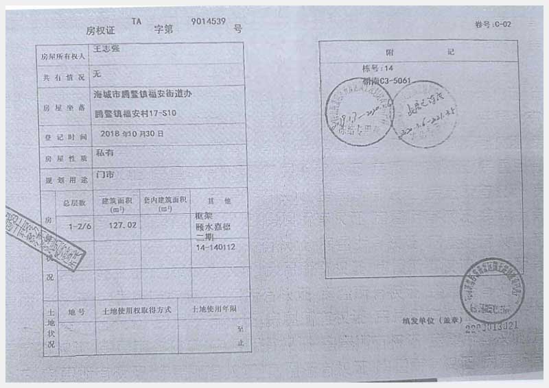 名稱(chēng):海城市騰鰲鎮(zhèn)頤水嘉德二期福安村17-S9、S10房產(chǎn) 面積:178.22㎡、127.02㎡ 瀏覽次數(shù):1281
