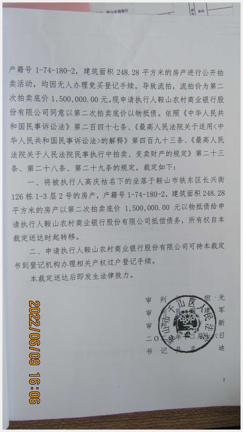 地址:鞍山市鐵東區(qū)長興街126棟 標的號:85