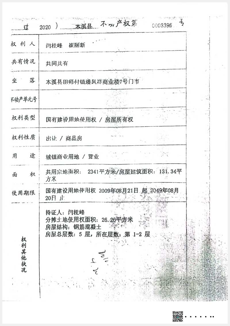 153-2號 本溪滿族自治縣田師付鎮(zhèn)潘鳳祥商業(yè)樓7號門市