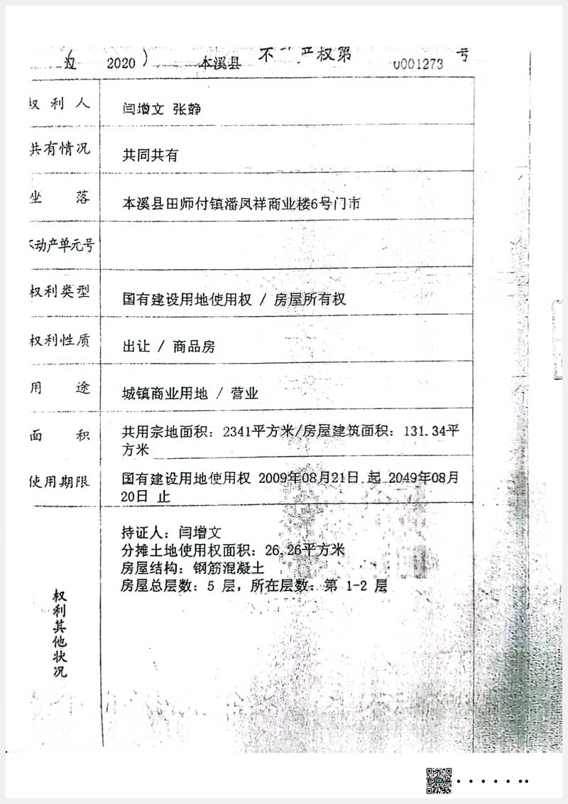 153-3號 本溪滿族自治縣田師付鎮(zhèn)潘鳳祥商業(yè)樓6號門市